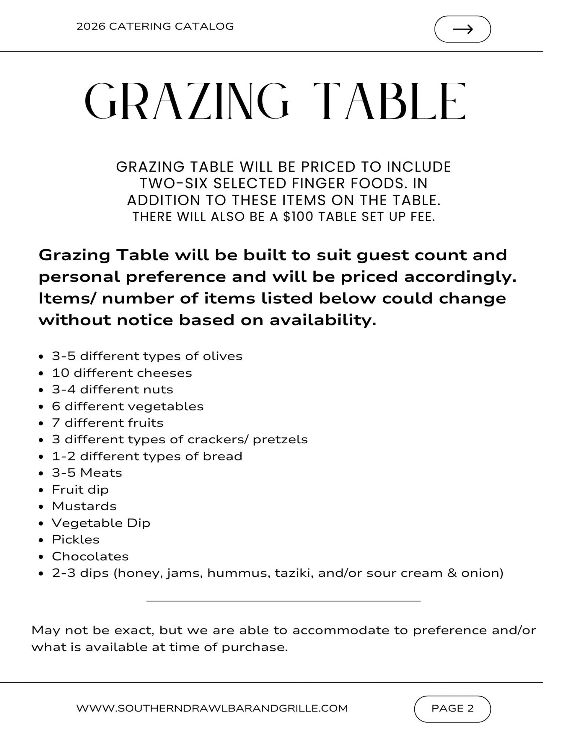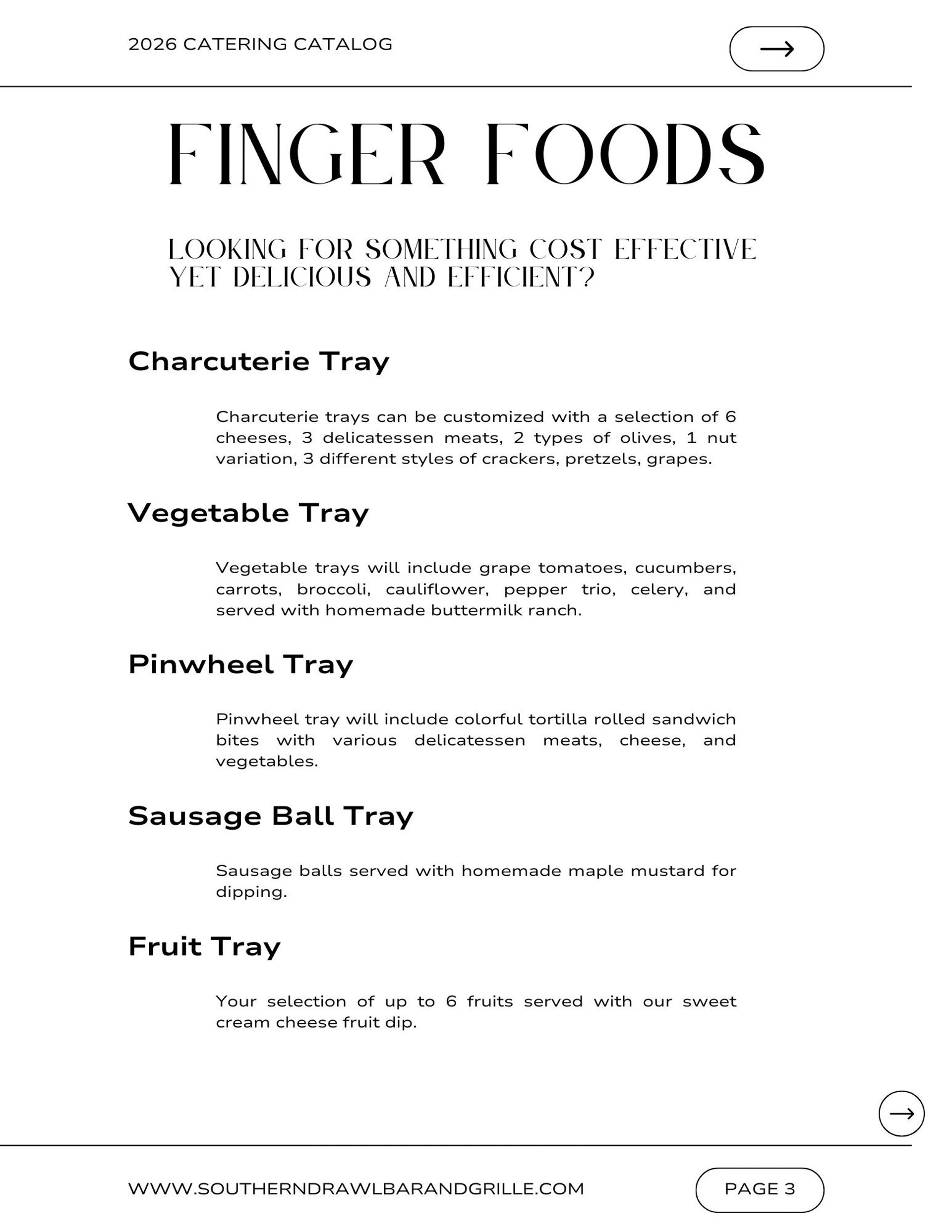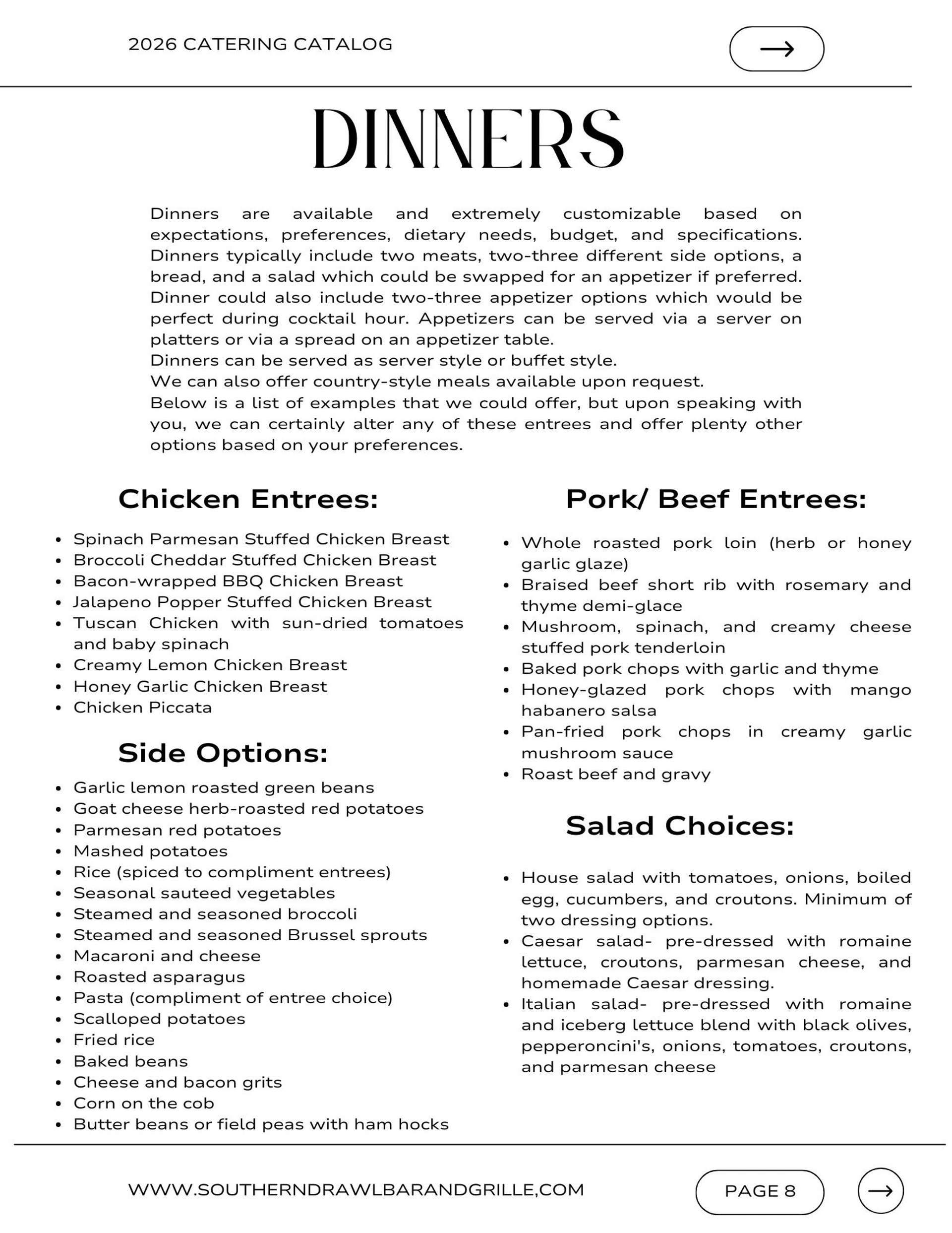 Please call to inquire regarding full spread catering, coursed meal catering, elevated meal catering, boxed lunch catering, full pan catering, or wedding/event catering.