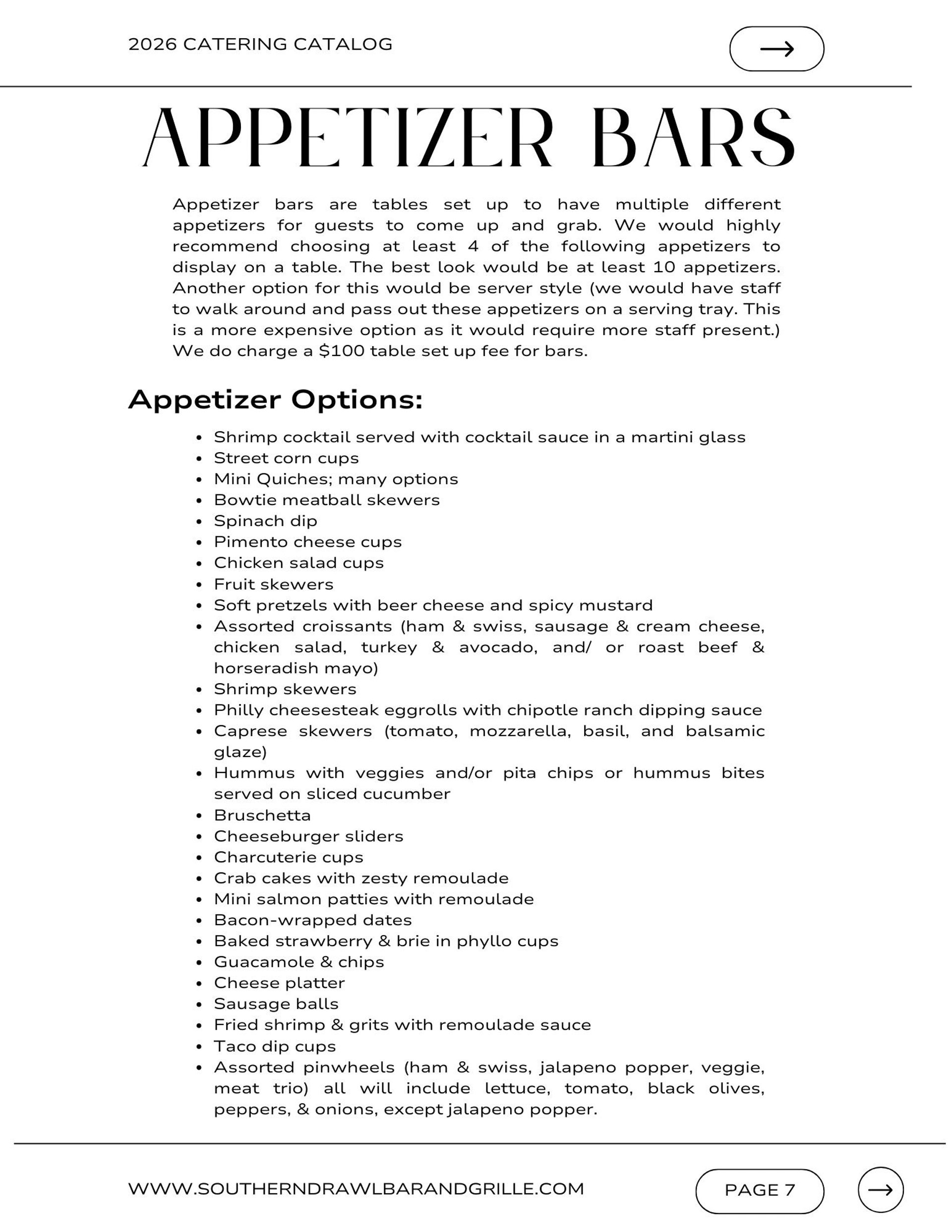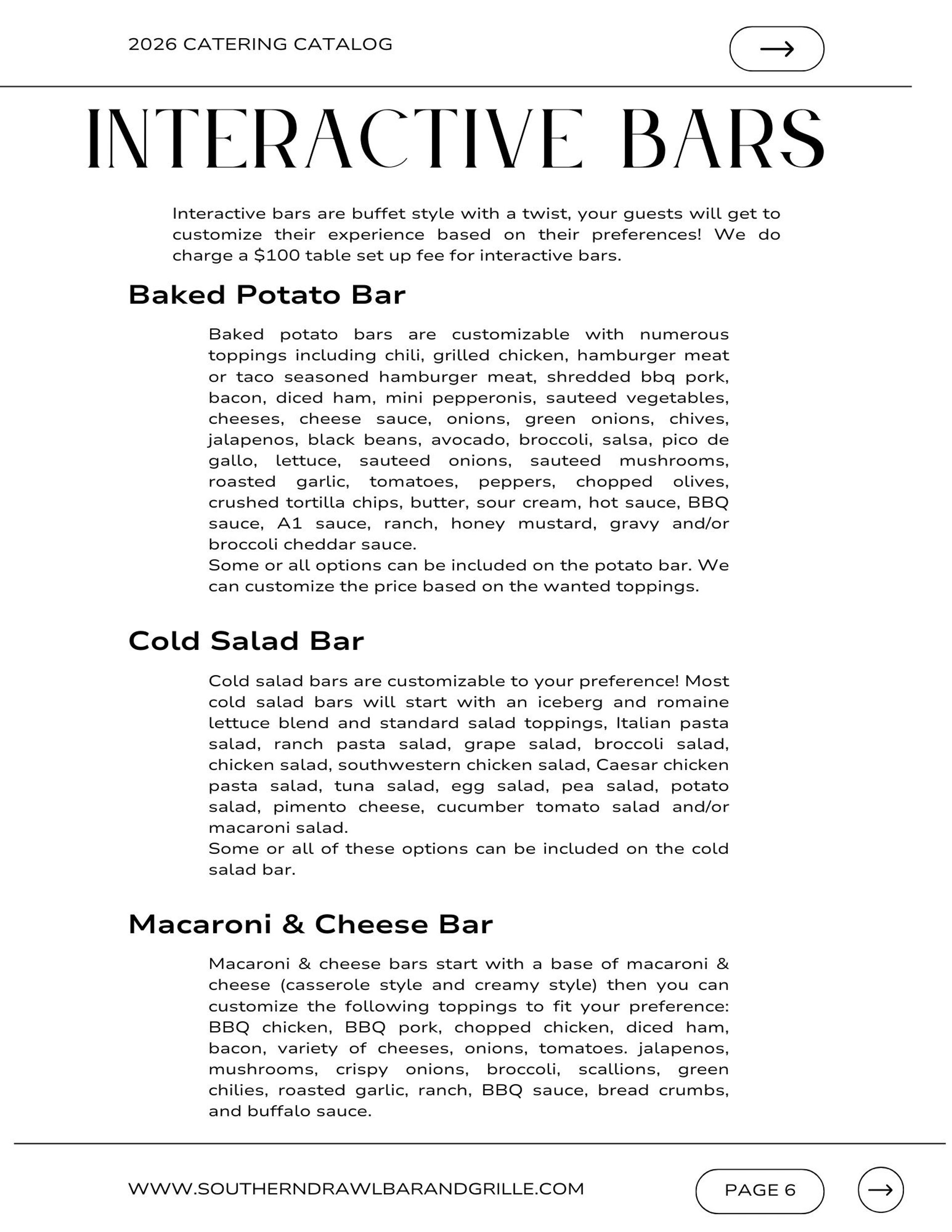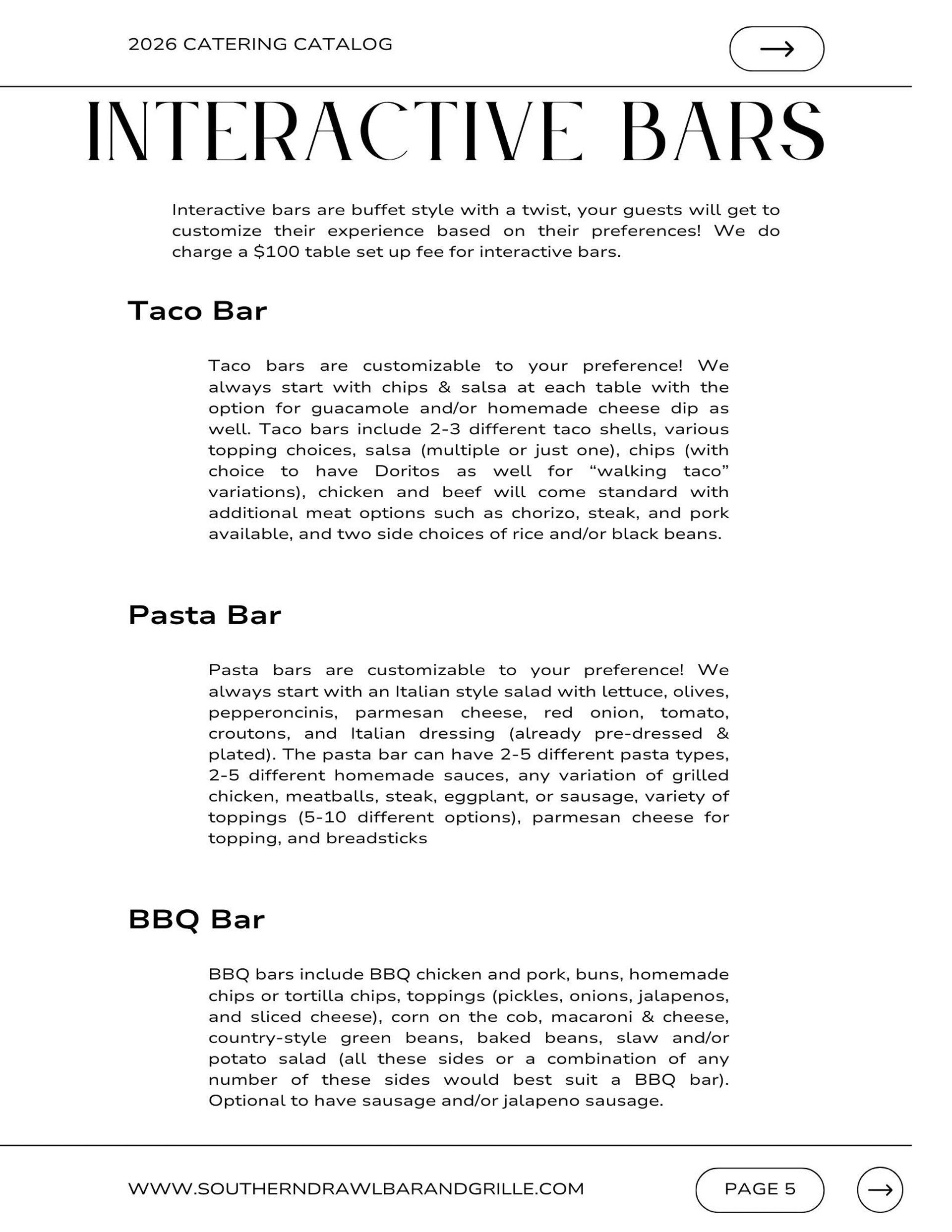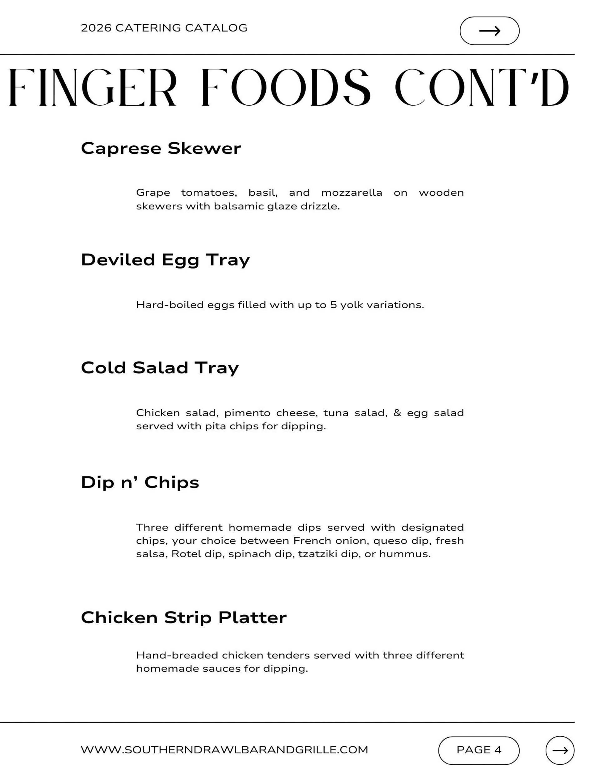 Please call to inquire regarding full spread catering, coursed meal catering, elevated meal catering, boxed lunch catering, full pan catering, or wedding/event catering.
